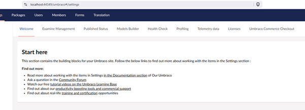 The basic Umbraco configuration is complete. The next step is to set up the Umbraco Commerce side of the site so that Umbraco can integrate and communicate with it.
