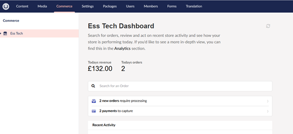 To view and manage orders within the CMS, go to the Commerce section. This menu item was enabled during the initial setup steps. If it's not visible, please revisit the earlier instructions for configuring Umbraco Commerce.