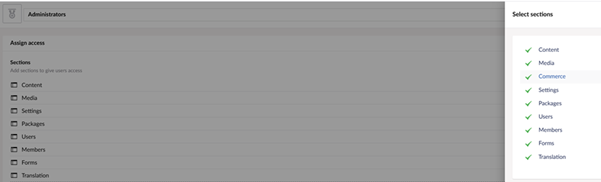 The configuration under the Settings tab is used to set up Commerce and typically should only be accessible to users with the appropriate privileges. To restrict access, we’ll assign permissions specifically to the logged-in user. Click Permission next to the store, then enable the checkbox for the intended user to be granted access to the Commerce section. Finally, click Save.