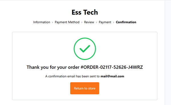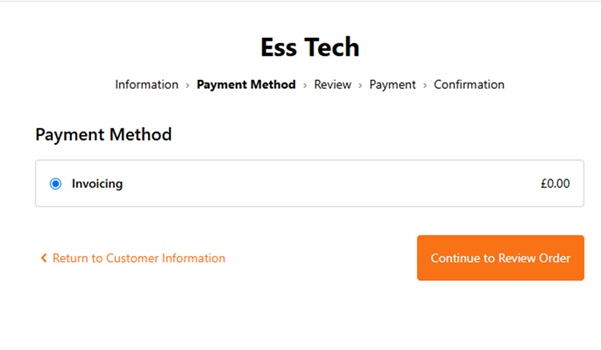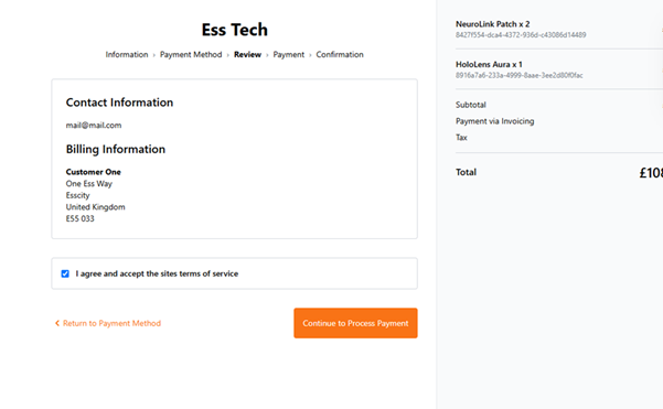 Click to continue to the payment method set (this is configured under Settings > Commerce > Stores > Ess Tech > Payment Methods, more information can be found at https://github.com/umbraco/Umbraco.Commerce.Checkout).