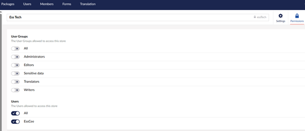 The configuration under the Settings tab is used to set up Commerce and typically should only be accessible to users with the appropriate privileges. To restrict access, we’ll assign permissions specifically to the logged-in user. Click Permission next to the store, then enable the checkbox for the intended user to be granted access to the Commerce section. Finally, click Save.