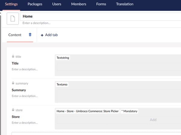 Reserved alias: Do not change the alias. The alias listed is required for integration with Umbraco Commerce.