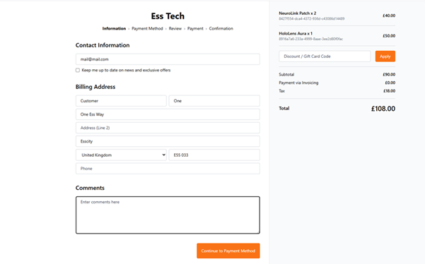 Click to continue to the payment method set (this is configured under Settings > Commerce > Stores > Ess Tech > Payment Methods, more information can be found at https://github.com/umbraco/Umbraco.Commerce.Checkout).